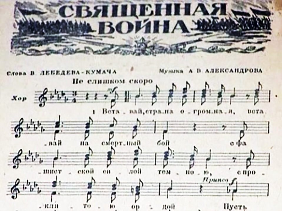 Ce sont-là les paroles du chant Sviachtchennaïa Voïna, ou « Guerre sacrée », l'un des plus célèbres chants de la Grande Guerre patriotique (1941-1945) en Union soviétique. Écrites par le poète Vassili Lebedev-Koumatch, ces paroles ont été publiées le 24 juin 1941 par les journaux Krasnaïa Zvezda et Izvestia, soit à peine deux jours après l'attaque allemande. Le lendemain, le 25 juin, Alexandre Alexandrov, fondateur des célèbres Chœurs de l'Armée rouge (qui porte son nom depuis 1946) et auteur de l'Hymne de l'Union soviétique, en composa la musique. Le temps manquait pour imprimer les textes et les partitions, les chanteurs et les musiciens devaient les copier dans leurs cahiers. Le chant retentit pour la première fois le 26 juin 1941 à la gare ferroviaire de Belorousskaïa, à Moscou, exécuté par une partie des Chœurs de l'Armée rouge pour encourager les soldats qui attendaient leur départ pour le front.