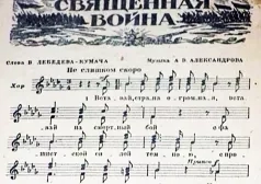 Ce sont-là les paroles du chant Sviachtchennaïa Voïna, ou « Guerre sacrée », l'un des plus célèbres chants de la Grande Guerre patriotique (1941-1945) en Union soviétique. Écrites par le poète Vassili Lebedev-Koumatch, ces paroles ont été publiées le 24 juin 1941 par les journaux Krasnaïa Zvezda et Izvestia, soit à peine deux jours après l'attaque allemande.