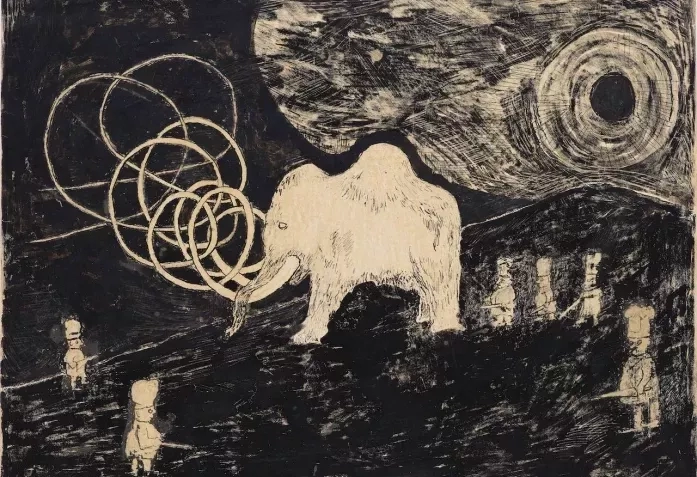 Дюрренматт Ф. Мамонт в окружении охранников.Без даты. Бумага, перо (граттаж). Из частной коллекции. © CDN / Schweizerische Eidgenossenschaft