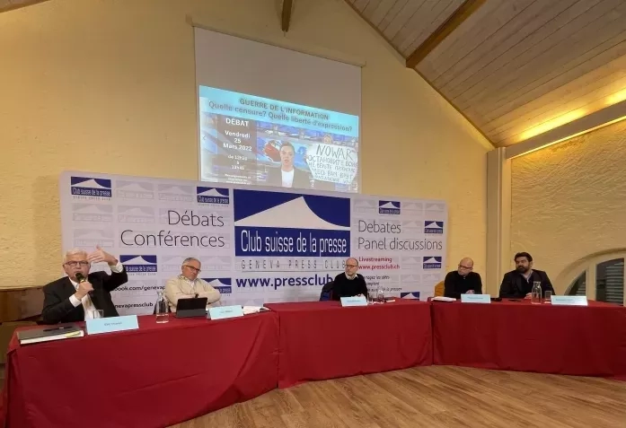 «В то время как российско-украинский конфликт набирает силу, информационная война вызывает возмущение и принимает невиданные масштабы. Отзвуки этой войны между сторонниками подобия «военной цензуры» и защитниками неограниченной свободы слова докатываются до Швейцарии. Является ли информация оружием войны, и, если да, какова ее реальная ударная сила? Есть ли оправдание цензуре во время войны? Должна ли пресса занимать чью-то сторону? Состоит ли ее миссия в защите демократии любой ценой? И что тогда со свободой слова? Сведенная до минимума или полного отсутствия в России, находится ли эта свобода под угрозой в Европе, в Швейцарии? Имеют ли право на существование «понимание», а то и поддержка некоторых реакций Владимира Путина и критика Запада? Каким правилам должны следовать журналисты во время войны?» К этому перечню в ходе дискуссии добавился важнейший вопрос о роли социальных сетей, впервые участвующих в информационной войне, ведь даже во время войны на Балканах их еще не было.