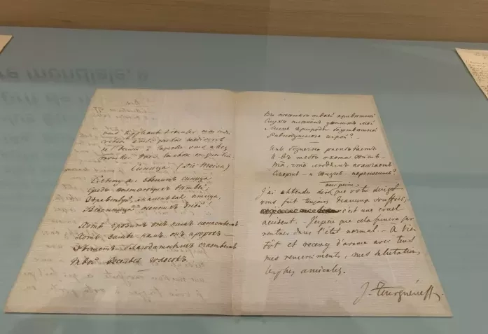 К огромной нашей радости, российские авторы представлены на выставке очень достойно! Не счастье ли прочитать в оригинале, хоть и через стекло, «Заметки из дневника» Максима Горького, отрывок из статьи Петра Кропоткина «Влияние Л. Н. Толстого в России», басню И. А. Крылова «Василек», заметки Д. Мережковского к роману «Александр I», письмо И. С. Тургенева (на французском языке, но со стихотворением "Синица" на русском) его немецкому переводчику и фрагмент из «философского диалога» В. Соловьева... Дух захватывает и голова идет кругом от возможности такого соприкосновения.