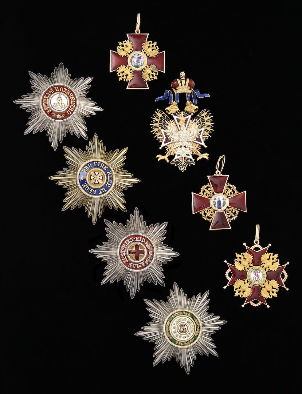 Pour ma part, ce sont surtout les distinctions impériales russes qui ont retenu mon attention. Il convient de rappeler qu’elles ne furent pas attribuées pour des mérites personnels au sens moderne, mais avant tout comme marques d’honneur dynastiques et diplomatiques, selon une pratique courante des cours européennes au début du XXᵉ siècle. Ainsi, le lot phare – l’Ordre impérial de Saint-André Apôtre le Premier Nommé, la plus haute distinction de l’Empire russe – fut remis en 1910 au prince de Piémont, âgé de six ans, en tant qu’héritier d’une monarchie alliée. Institué par Pierre Ier en 1698, cet ordre est représenté par un insigne et un collier en or et émail réalisés par l’orfèvre Johann Lindstedt pour la maison Édouard, accompagnés d’une plaque et de leur écrin d’origine. Sur les cérémonies de cour, la large écharpe bleue, la croix de Saint-André et le riche collier d’or identifiaient immédiatement son porteur comme membre du « club des monarchies ». Traditionnellement, l’Ordre de Saint-André s’accompagnait d’un ensemble d’autres distinctions russes – Sainte-Anne, Saint-Alexandre Nevski, Aigle blanc et Saint-Stanislas – formant une véritable hiérarchie honorifique illustrant le degré de faveur impériale et la profondeur des relations dynastiques. Un rare ensemble de ces quatre ordres sera également présenté aux enchères genevoises.