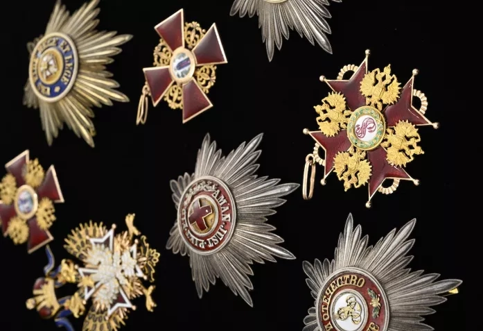 Parmi les pièces majeures figure également l’Ordre suprême du Christ (lat. Supremus Ordo Christi), la plus haute distinction pontificale, conférée par le pape. Humbert, alors âgé de vingt-cinq ans, en fut décoré en 1929 dans le contexte des accords du Latran, qui consacrèrent l’indépendance du Vatican. Aujourd’hui presque inaccessible, cet ordre symbolise un moment clé de l’histoire politique et religieuse européenne. La collection comprend aussi les plus hautes distinctions de Suède et de Belgique – l’Ordre des Séraphins et le grand-cordon de l’Ordre de Léopold – ainsi que la Légion d’honneur française, l’Ordre de Saint-Charles de Monaco et des décorations de Roumanie, de Bulgarie, des Pays-Bas, de Serbie et d’autres pays.