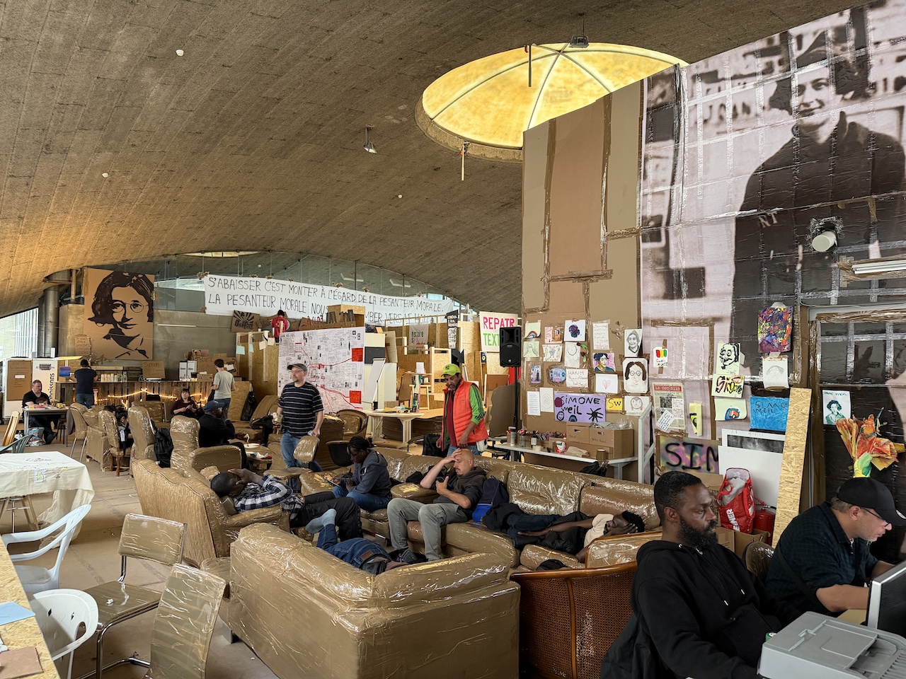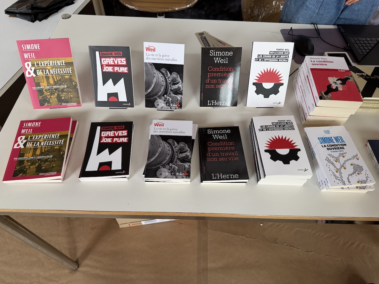 Признаюсь, на пороге я замешкалась, настолько поразило меня увиденное. В огромном помещении, напоминающем скорее ангар, чем выставочное пространство, справа от входа шла тренировка по боксу, а слева люди толпились у столика с книгами – на обложках многочисленных изданий был указан один и тот же автор: Simone Weil. Так вот в чем дело! Не Veil, а Weil, то есть совсем другая Симона, о которой я, признаюсь, ничего не знала, хотя «русский акцент» у нее, как выяснилось, налицо. И лицо это, многократно увеличенное, взирало на меня со всех стен и специально установленных щитов, типичное лицо интеллектуалки начала 20 века: короткая стрижка, очки, умные глаза, искренняя улыбка…
