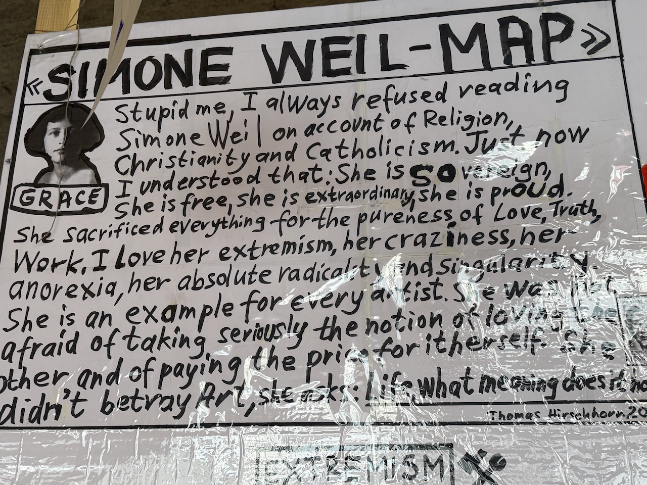 Рядом с «картой жизни Симоны Вейль», нарисованной Томасом Хиршхорном, помещено объяснение автором своего проекта, с которым полезно ознакомиться каждому посетителю. Вот текст: «Глупец я, что всегда отказывался читать Симону Вейль из-за религии, христианства и католицизма. Только сейчас я понял: она – суверенна, она свободна, она необыкновенна, она горда. Она пожертвовала всем ради чистоты Любви, Истины, Труда. Я люблю ее экстремизм, ее безумие, ее анорексию, ее абсолютную радикальность и уникальность. Она – пример для каждого художника. Она не боялась всерьез отнестись к идее любви к другому и заплатить за это самой. Она не предала Искусство, она не лгала. Какая трогательная судьба».
