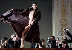 По ходу спектакля портрет царя сменяется портретом Ленина, затем Сталина, затем Хрущева… Хор поет очень советскую по звучанию песню о том, что «Родины себе не выбирают». А портрет Вагановой висит себе и висит. Зритель же «проживает» жизнь Рудольфа Нуриева в прекрасном исполнении (они даже внешне чем-то похожи, красавцы) Давида Соареса, бразильского артиста балета, до марта 2022 года – ведущего солиста Большого театра, а с тех пор – премьера Государственного балета Берлина. Вместе с ним, одновременно хрупким и несгибаемым, нежным и жестким, мы переносимся в класс педагога Нуриева Александра Ивановича Пушкина, воспитавшего не только «Руди», но и Михаила Барышникова и Аллу Осипенко, тоже присутствующую в спектакле, наравне с другими друзьями и партнерами Рудольфа Нуриева на сцене и в жизни: это Марго Фонтейн (в исполнении Яны Саленко), Наталья Макарова, Шарль Жюд, Эрик Брун... Присутствуем на той самой исторической фотосессии Ричарда Авердона, уговаривающего Нуриева не позировать, а быть самим собой, после чего артист и остается в костюме Адама, а чуть позже – на распродаже сделанных тогда снимков, которые за бешеные деньги раскупают дамы позднего бальзаковского возраста. Танец на столе обнаженного Рудольфа Нуриева – Давида Соареса в норковой шубе, доводящий чувствительных дам до обморока, – отдельный маленький шедевр.
