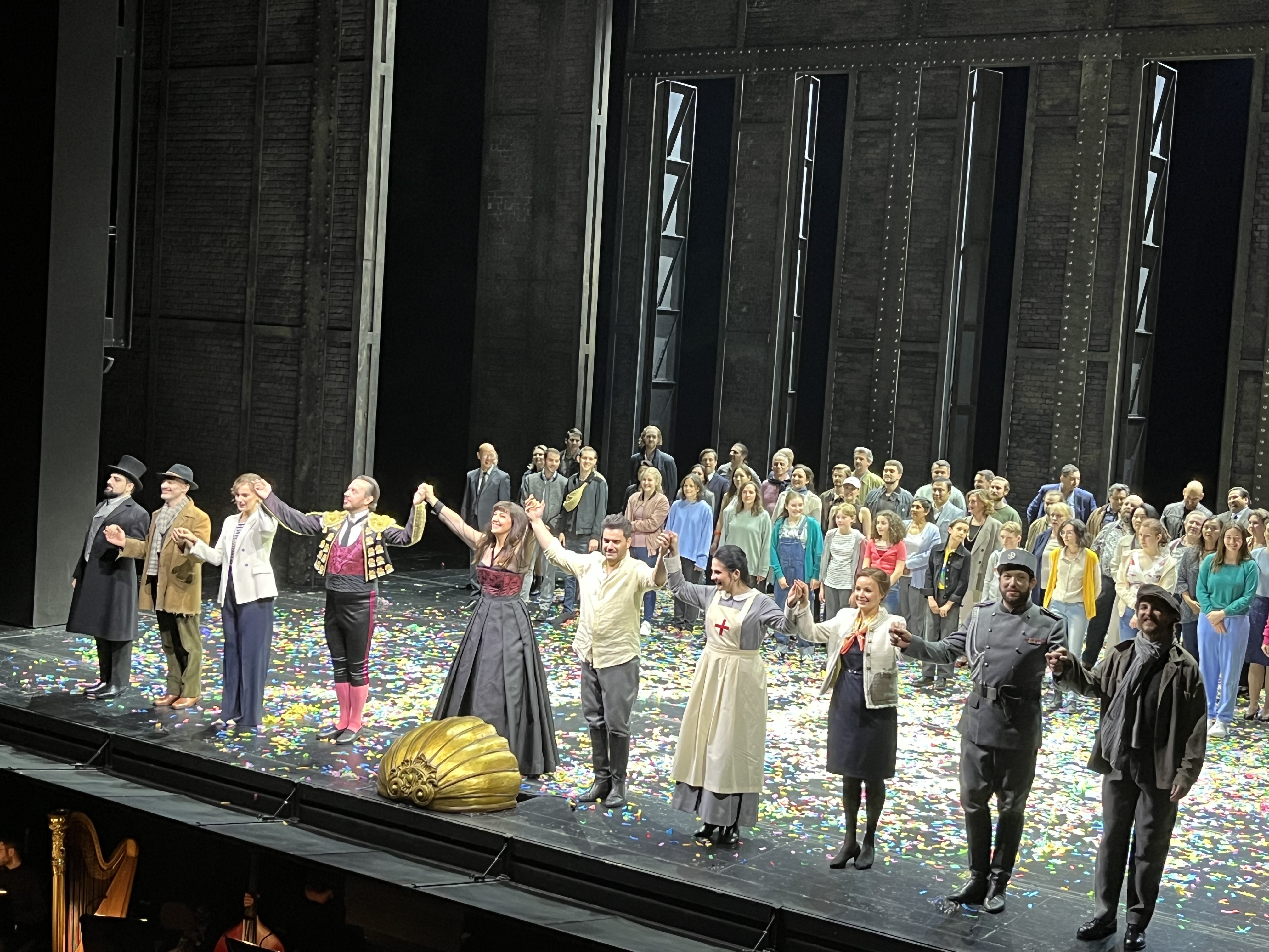 Сценография спектакля вполне минималистская, самое яркое пятно на сцене – «золотая» суфлерская будка. За основу художник-постановщик Поль Золлер взял зал самой Комической оперы с ее кирпичными красно-коричневыми стенами и стальными балками, выкрашенными в темно-серый цвет. Но ничего другого и не нужно: лишняя «мебель» не отвлекает внимания от исполнителей, а вечность сюжета на фоне сменяющихся эпох передается ненавязчиво и, может быть, даже не для всех заметно – просто сменой костюмов от традиционных в начале спектакля до вполне современных в конце.