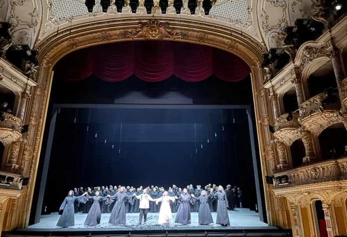 Как же мы рады, что не поленились, и что предчувствие нас на этот раз обмануло. Нет, в вокально-музыкальной стороне мы не сомневались, но вот насчет сценографии и режиссерской трактовки опасения были, и серьезные. Дело в том, что в переживаемый оперным театром период режиссерского самовыражения порой даже самых мощных дуэтов композиторов + авторов литературной основы бывает недостаточно, чтобы противостоять фантазии, иногда безудержной, постановщика. Фантазии, на наш взгляд, порой лишенной здравого смысла и вкуса. Поэтому о гениальной музыке Верди говорить не будем – она вне конкурса и в наших эпитетах не нуждается: и мурашки от нее, и восторг, и слезы… Каждая ария, каждый ансамбль, каждый хор… Сконцентрируемся на происходящем на сцене, тем более, что мы категорически не приняли прочтение австралийцем Барри Коски ни «Евгения Онегина» (Чайковский+Пушкин), ни «Бориса Годунова» (Мусоргский+Пушкин) – оба спектакля также шли в Цюрихе.