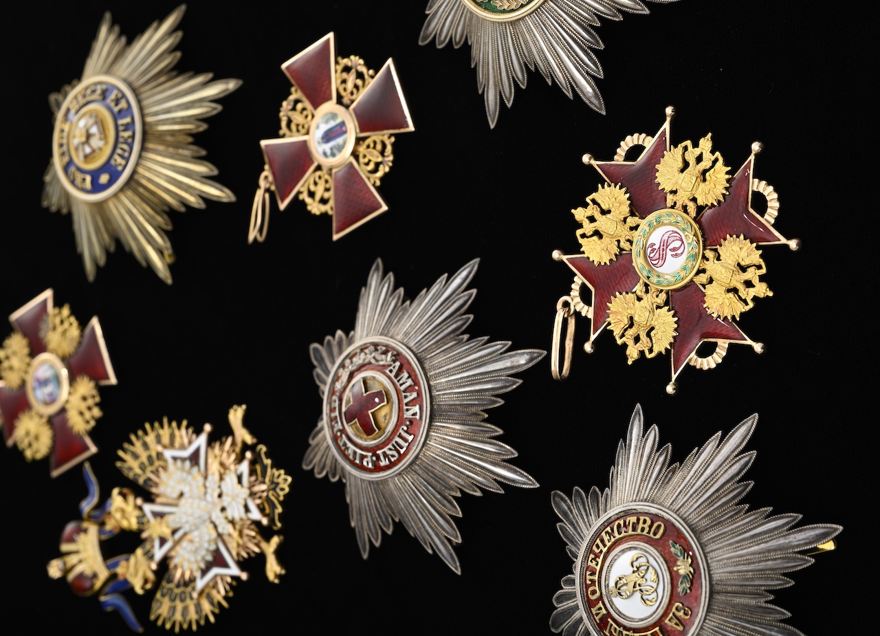 Но меня прежде всего интересовали, конечно, российские императорские награды, которых у Умберто набралась целая коллекция. Стоит отметить, что награды эти он получал не за личные заслуги в современном смысле, а прежде всего как династическое и дипломатическое отличие, что было обычной практикой европейских дворов начала XX века. Так, ключевой лот коллекции, Императорский орден Святого апостола Андрея Первозванного, высшая награда Российской империи, был вручен шестилетнему принцу Пьемонтскому в 1910 году как наследнику престола дружественной монархии в знак признания его статуса и как жест укрепления союза между правящими династиями – в начале XX века Савойский дом и российский императорский двор поддерживали тесные отношения. Учреждённый Петром I в 1698 году орден представлен знаком и цепью из золота и эмали, выполненными ювелиром Иоганном Линдштедтом для дома Édouard, а также звездой и оригинальным футляром. Этот орден был чрезвычайно узнаваем: на придворных церемониях голубая лента через плечо, косой андреевский крест и богатый золотой коллар сразу выделяли его обладателя как члена «клуба монархов». Ордену Святого апостола Андрея Первозванного традиционно сопутствовал целый набор других российских орденов: Святой Анны, Александра Невского, Белого орла, Святого Станислава. Это создавало своего рода иерархическую лестницу, показывающую степень благоволения императорского двора и глубину междинастических отношений. Редкий комплект из этих четырёх российских императорских орденов также будет выставлен на женевские торги.