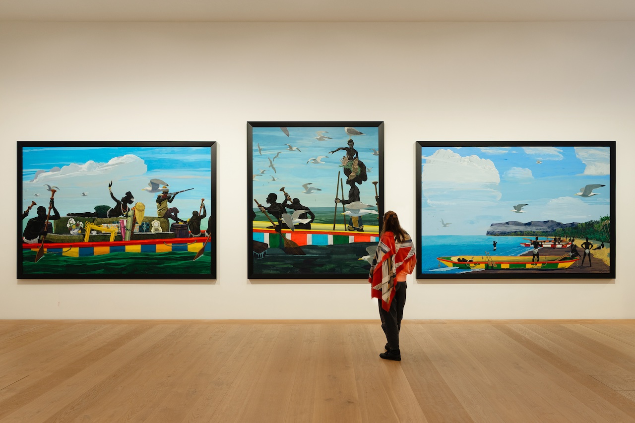 Полотна Керри Джеймса Маршалла, среди которых есть и портреты, и сцены повседневной жизни, и историческая живопись, поражают прежде всего своими размерами (некоторые достигают семи метров в ширину) и буйством красок. Однако под этой внешней яркостью, создающей ощущение легкости и беззаботности, скрываются сложные художественные истории, посвященные темам гражданских прав, трансатлантического рабства, взаимопроникновения культур и, конечно, истории родной автору повседневной чёрной культуры. Недаром выставка называется «Истории» – с большой буквы. Приглядитесь, например, к фрагменту картины «Terra incognita » (1991) со списком товаров рабовладельческого судна: «золото, слоновая кость, негры». Это одна из пяти представленных на выставке картин, отражающих попытку Маршалла обратиться к истории Срединного пути – опасного перехода через Атлантический океан, во время которого многие пленённые африканцы умирали, не достигнув невольничьих рынков в Америке.